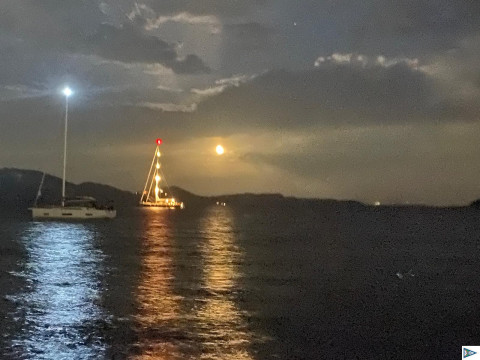 Wir ankerten deshalb in der Kampi Bucht etwas weiter südlich. Am Nachmittag zog von Norden eine Front auf. Auf der Weiterfahrt zur Südküste waren wir Fallwinden von bis zu 27kn ausgesetzt. Die große Bucht im Süden von Zakynthos bot uns für die Nacht einen sicheren Ankerplatz auf 5 Meter Tiefe. Der Anker hielt trotz drehender Winde bis zu 20 Knoten. Zweimal mussten wir heute Nacht aufstehen, um die Luken zu schließen, kurze Regenschauer zollten ihren Tribut. Nach jeweils 10 Minuten waren sie dann aber schon wieder vorbei und wir öffneten alles wieder, denn sonst steigt die Temperatur im Schiff auf ein den Schlaf beeinträchtigen Wert.