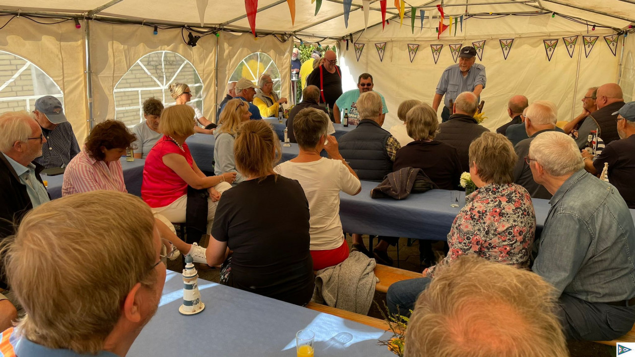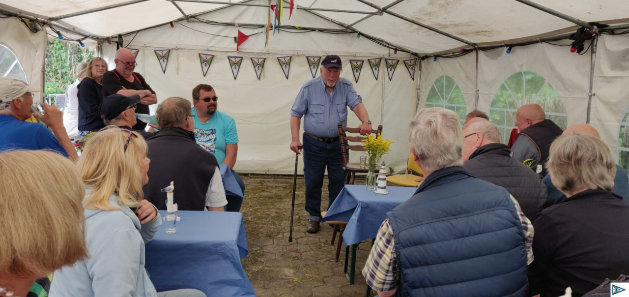 Der Wettergott war uns hold, Commodore Weidling erzählte launige Anekdoten aus der Gründungszeit der SKB, und der HEIDJER-SHANTY-CHOR sorgte für gesungene Untermalung. Die Stadfest-Crew hatte im Vorwege Gelegenheit, den Zeltaufbau schon einmal zu probieren, und der MOORWEGHOF  nutzte die Chance, uns die Steaks für das kommende Stadtfest schon probieren zu lassen. Schließlich müssen wir doch wissen, was wir den Stadtfestbesuchern verkaufen.