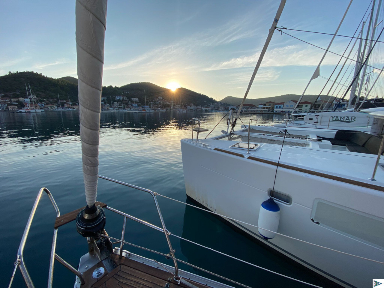 heute Morgen genießen wir den Sonnenaufgang über dem vorgelagerten Bergrücken in Vanthy auf Ithaka. Hierin hat es uns gestern, nachdem wir ein paar technische Fragen geklärt hatten und in Nydri aufbrachten, verschlagen. Die Fahrt meisterte die HW unter Maschine, da der Wind nur sachte und von vorne wehte. Unser erster Anlaufpunkt sollte der kleine Hafen von Kioni sein, der war leider schon voll belegt und die Ankerlieger hatten jeweils zwei lange Heckleinen so ausgebracht, das unser Anlegemanöver sicher Diskussionen hervorgerufen hätte. So entschieden wir uns für die Weiterfahrt in die nächste Bucht nach Vathy.Römisch katholisch angelegt merkten wir aber, dass der Anker nicht hielt und brachten ihn mit dem Dinghi erneut aus. Nun hielt er auch die am späten Nachmittag einsetzenden starken Fallwinde aus. Heute Morgen strahlender Sonnenschein und kein Wind.