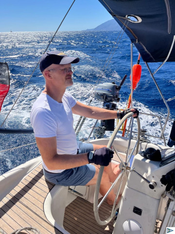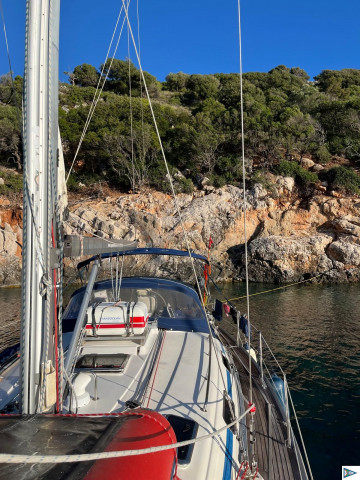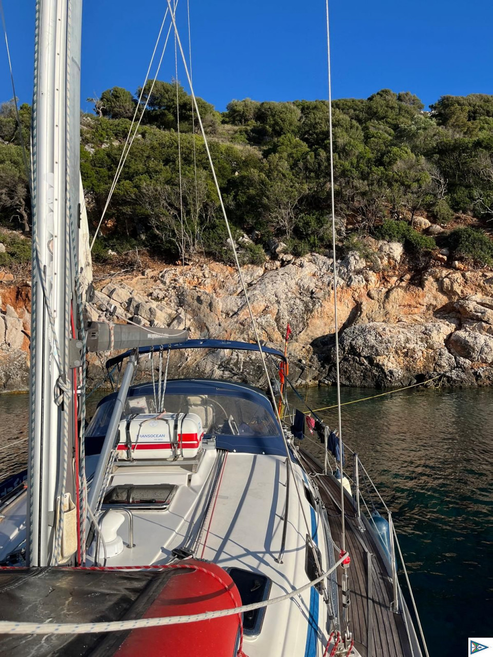 Hallo Karlo, von der Insel Kalamos ging es gestern herüber nach Ithaki. Wunderschön, ordentlich Wind auf Halb-Wind Kurs, unser Schiff zeigt sich wieder einmal von seiner besten Seite hoch am Wind. Beim White Pebble Beach haben wir den Anker nicht zum Halten gebracht, so dass wir kurzerhand umdisponiert haben und Richtung Filiatros Beach gefahren sind. Unsere Vorstellung einer einsamen Bucht, in der wir ungestört Musik machen können, wurden je zerstört… 😀 Als wir dort den Anker gelegt, die Landleinen sicher am Fels angebracht hatten, fanden wir uns inmitten Party freudiger Segler wieder, die "unsere" wunderschöne einsame Bucht in eine einzige Partyzone verwandelt haben. Naja, wir sind ja flexible in unserer Abendgestaltung… 😀 Der morgendliche Sprung direkt über den Anker in das herrliche Ionische Meer hat uns für alle Entbehrungen des Vorabends entschädigt. Den heutigen Sgelvormittag haben wir mit "hoch-motiviertem Aufkreuzen" vor der Hafeneinfahrt von Agia Effimia beendet. Am Nachmittag haben wir uns Vespas geliehen, um die schöne Insel Kefalonia zu erkunden. Großartige Blicke über die Inselwelt, gekrönt durch den Käsekuchen bei Rosie im Bergdorf Karia. Unser Empfehlung des Tages! Nachdem wir uns erneut mit Proviant vom Supermark direkt an der Kaimauer eingedeckt haben, lassen wir nun den erfüllten Tag im Cockpit ausklingen. Zufrieden grüßen Veit, Felix, Mathias und Cornelius