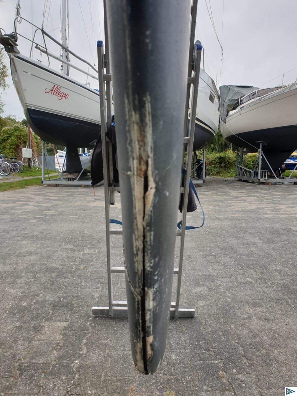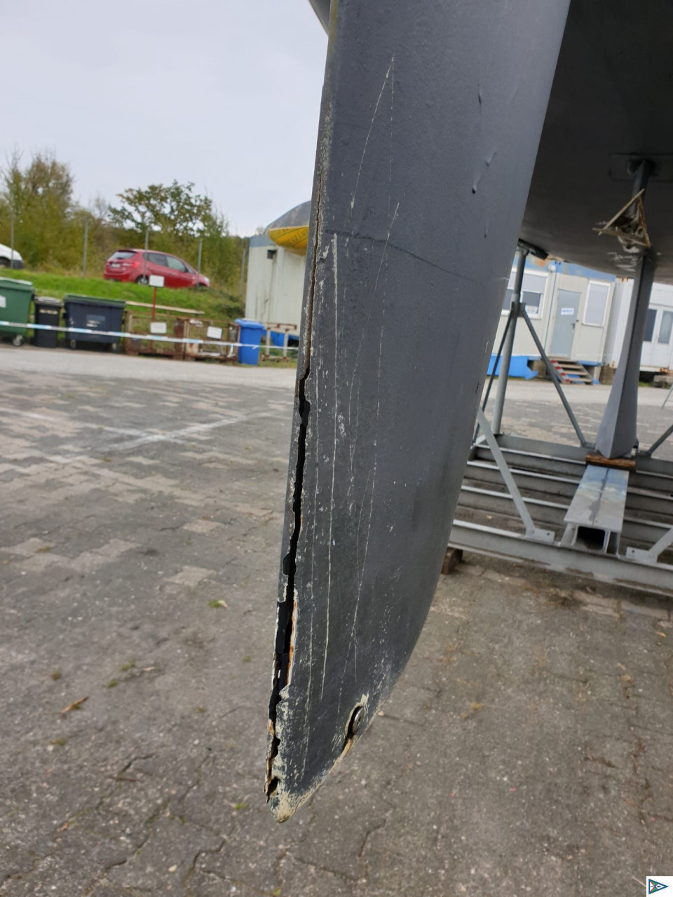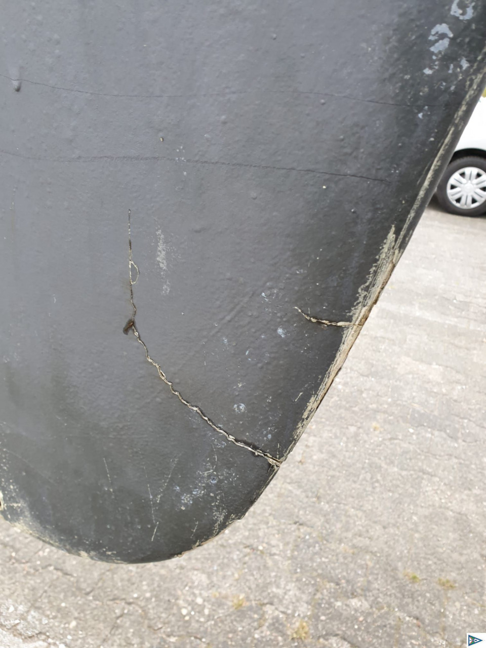 Bernd meldete soeben von der Teerhofiinsel in Lübeck: So, die Heide-Witzka steht an Land. Sehr sauberer Rumpf. Aber: !!!!!!!!