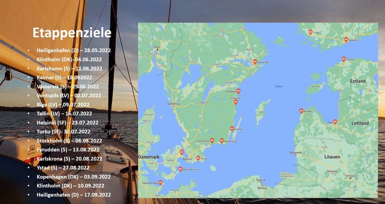 Nach den bisherigen Meinungsbildungsmaßnahmen ist davon auszugehen, dass der Vereinstörn mit der HEIDE-WITZKA im Jahr 2023 erneut ins Baltikum führen wird. Die entsprechenden Planungen werden in den kommenden Wochen von unserem Koordinator vorgenommen, die Gesamtplanung erfolgt selbstverständlich immer unter Berücksichtigung der aktuellen politischen Lage.